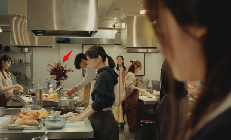 この料理の皿を持っている人物、顔は写っていませんが、結城旭でほぼ間違いないでしょう。この画像は梨々子のSNSにアップされたものなので、撮影者は梨々子で間違いないはず。そして撮影場所なんですが、結城旭の背後、左奥に花瓶に飾られた花が写っています。下記の画像は料理教室のシーンです。