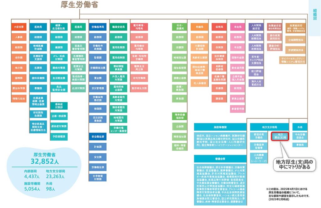 マトリは厚生労働省の管轄です。厚生労働省には各局があり、その下に課が配置されています。マトリは「地方支分部局」の下の「地方厚生(支)局」の中に設置されています。