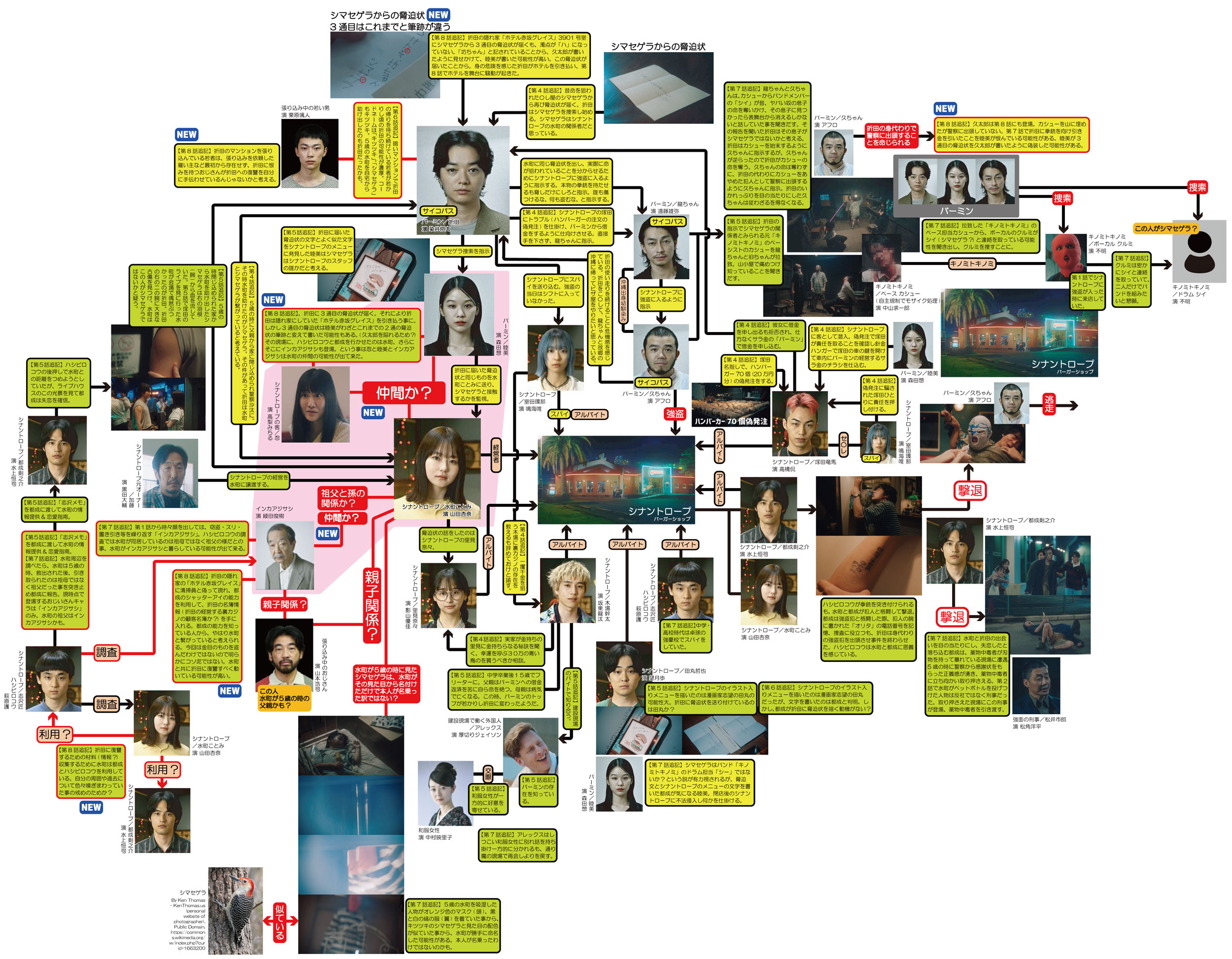 ドラマ「シナントロープ」は非常に情報量が多く、裏組織バーミン側の相関図一つとっても上記のように複雑になってしまうんですよ。現時点で第5話が終了していますが、このドラマのは、シマセゲラから脅迫状を受け取った折田(演 染谷将太) が、シマセゲラを探し出そうとすることでストーリーが進んでいくようです。どうやら、折田はバーガーショップ「シナントロープ」の新オーナー・水町がシマセゲラの関係者だと考えていましたが、どうやら関係なさそうと思い始めています。しかし、バーミンの睦美は脅迫状の筆跡から「シナントロープ」のスタッフの中にシマセゲラがいると確信しているようです。