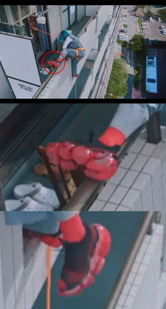 ドラマ「シナントロープ」第10話、マンションの13階のベランダから、クライミングロープ1本を使って室田環那が11階のベランダに垂直下降した際に、室田環那(演 鳴海唯)が履いていた特徴的なデザインのスニーカーに目を奪われた視聴者も多かったはず。