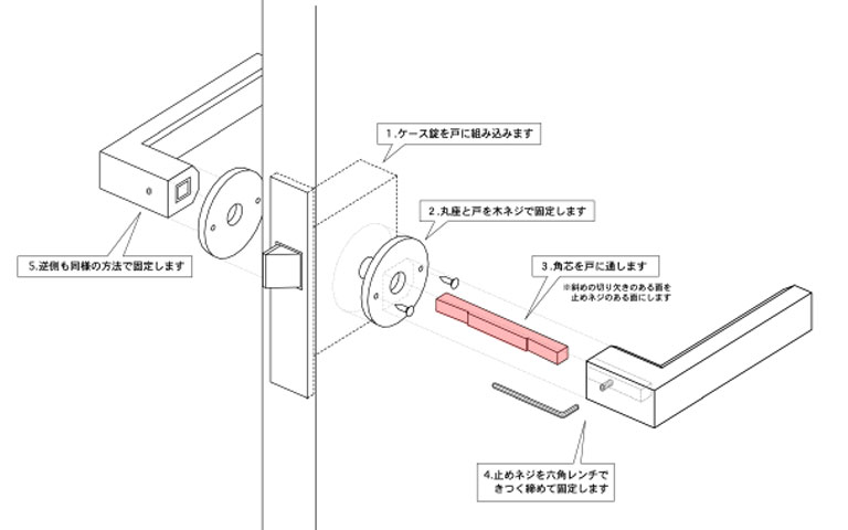 ドアノブレバーが外れて落ちるという事は、内側と外側のドアノブレバーをドア内部でつないでいる金属製の「角芯」と呼ばれる部材がドアノブレバーに六角ボルトでしっかり固定されておらず、抜け落ちてしまったことを意味します。