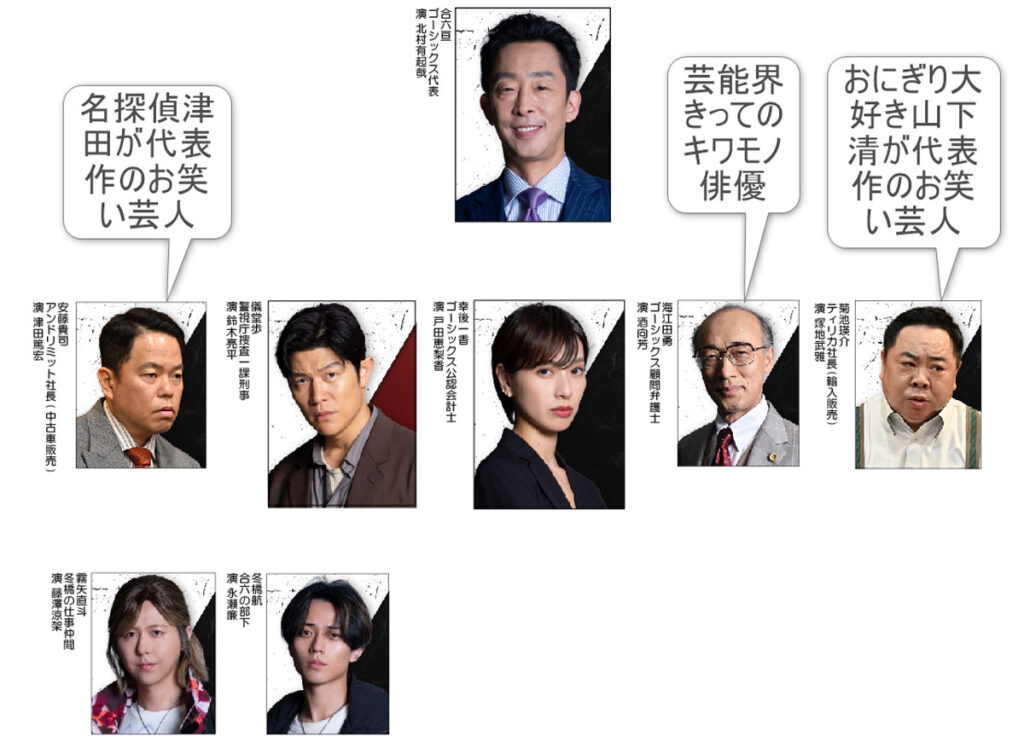 菊池役の塚地武雅さんは、「ぼ、ぼ、ボクはお、おにぎりが好きなんだな」で有名な山下清役を代表作に持つお笑い芸人ですし、安藤役の津田篤宏さんは代表作が「ゴイゴイスーの名探偵津田」ときていますから、この二人が、”裏組織”感が乏しく、裏社会とは著しくかけ離れたキャスティングと言えます。
