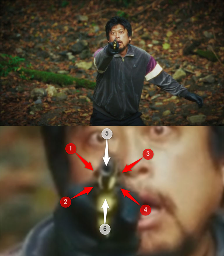 しかし、ホワイトボードに、この改造銃に何発装填でき、押収された時点で弾が何発残っていたのかは書かれていません。第1話で強盗犯が、森で拳銃を発砲するシーンをよく見ると、強盗犯の改造拳銃は、シリンダーの穴の位置関係から6発装填できる銃であることが分かります。