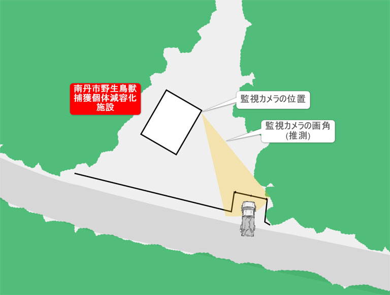 駆除された有害野生動物の処理施設として、2021年に完成した京都府南丹市の野生鳥獣捕獲個体減容化施設。この施設には、遠隔監視カメラが設置されているとされていますが、その監視カメラの取付位置によっては死角があるのではないか? という指摘があります。本記事ではその可能性について図解にて検証します。